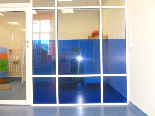 La société Adm films protection a réalisé la pose de film décoratif adhésif de couleur pour une crèche qui permet d'égayer la pièce toute en permettant une intimité pour la sieste des enfants.