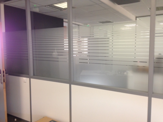 pose de film décoratif d'intimité sur les cloisons vitrées d'un open space de bureaux à Marseille